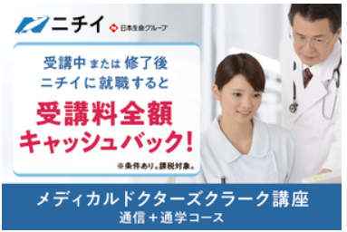 ニチイのメディカルドクターズクラーク講座(通信コース)の受講中または修了後、ニチイグループ企業に就職すると受講料を全額キャッシュバック。