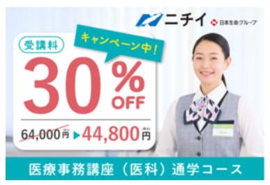 ニチイの医療事務講座(医科)通学コースは、受講料30%OFFキャンペーン実施中!
