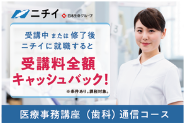 ニチイの医療事務講座(歯科)通信コースの受講中または修了後、ニチイグループ企業に就職すると受講料を全額キャッシュバック。